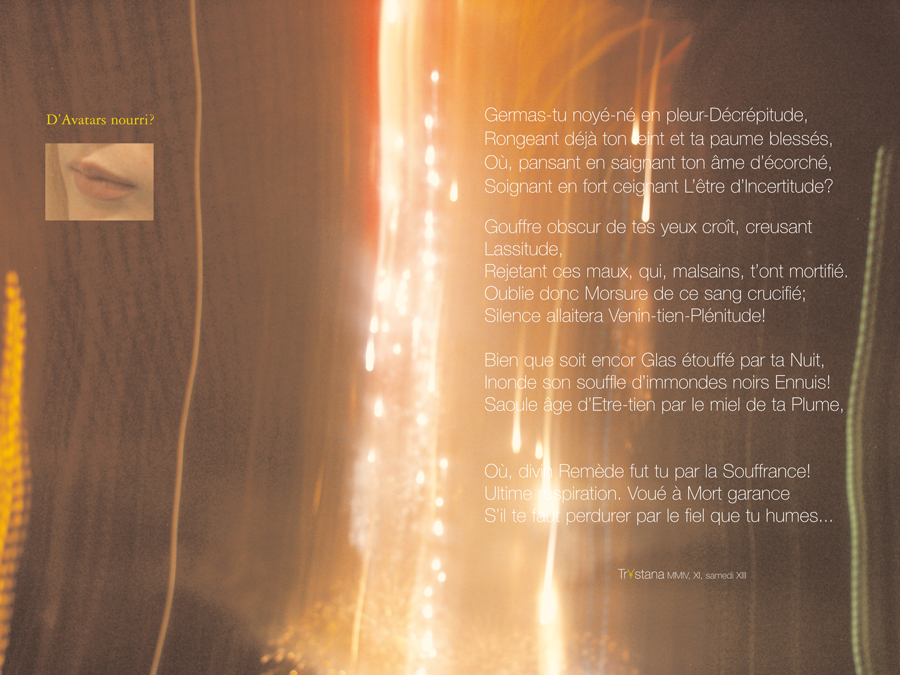 « Ma recherche ainsi que mon ambition littéraires et artistiques consistent à dévoiler la remembrance du Temps à travers la Mort en voilant l’existence d’une confusion de l’être »