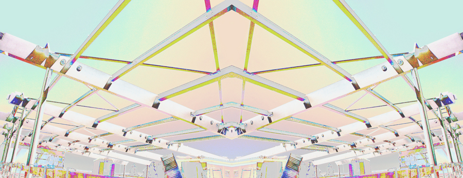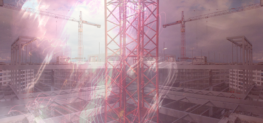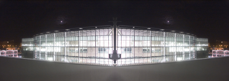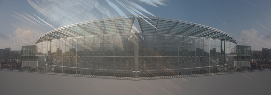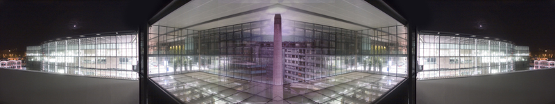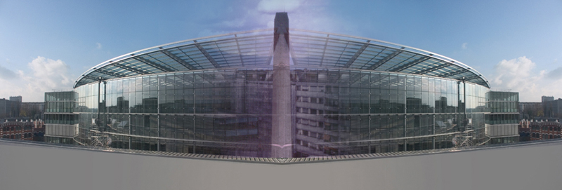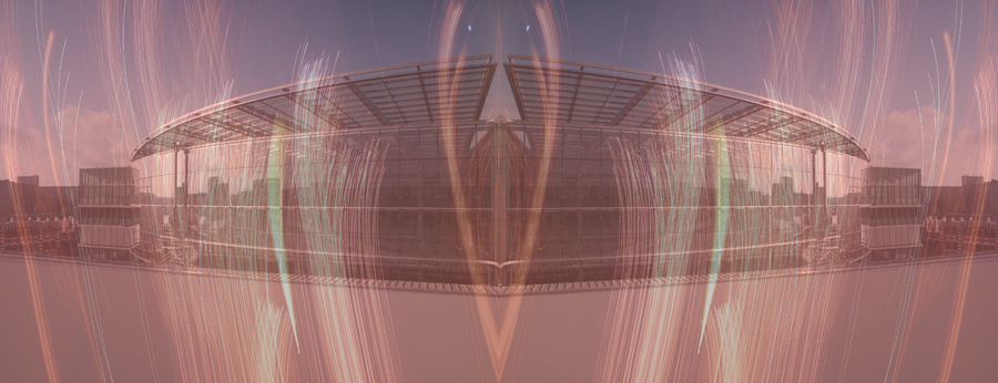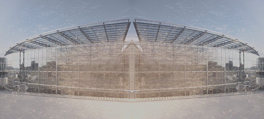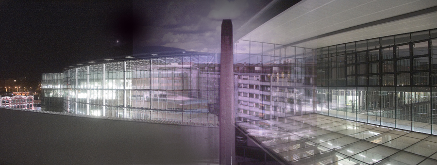 Selon celui-ci, il semblerait que l’effigie de la virilité ait été détruite pour être remplacée par celui de la féminité… Pour s’en convaincre, il suffit d’admirer, de l’atelier de l’artiste, le toit mobile incurvé et convexe du complexe entr’ouvert un soir d’été, lorsqu’il circonscrit une cavité allongée, mystérieuse, presque physiologique… et de prendre ainsi conscience de son potentiel érotique féminin. Aussi, dans certaines images tardives, le peintre a-t-il, à dessein, figuré l’impossible rencontre des deux emblèmes… celui du passé semblant « fertiliser » celui du présent… un pouvoir de l’art… puisque le présent urbain ne peut exister dans notre réalité contemporaine qu’en se substituant à son passé !