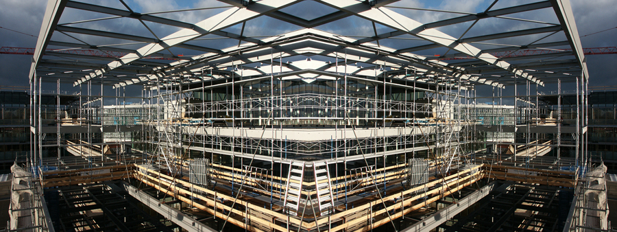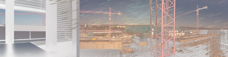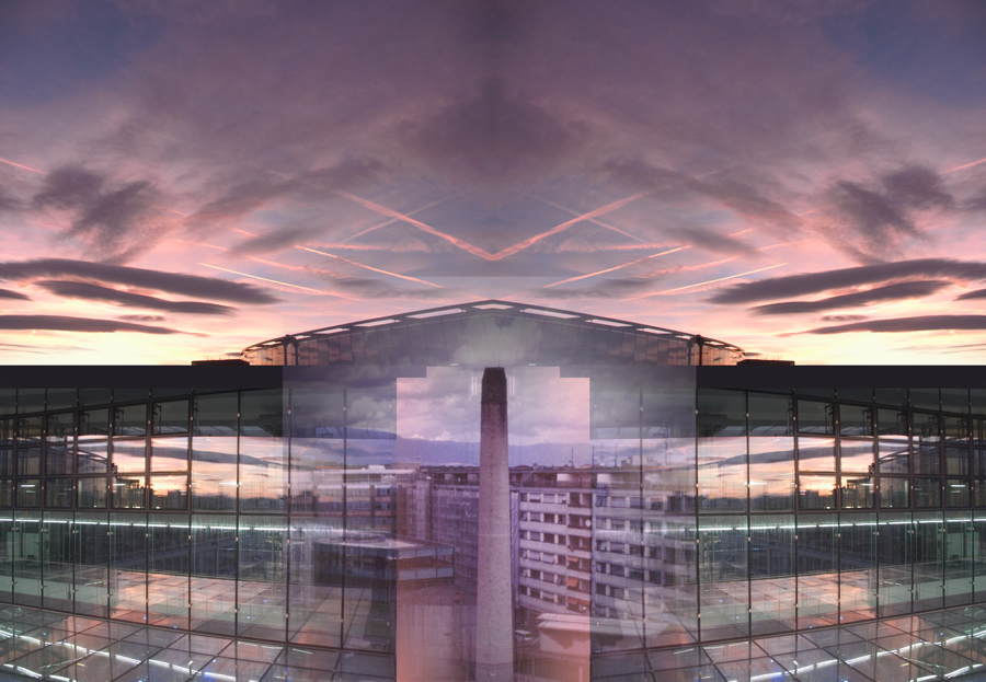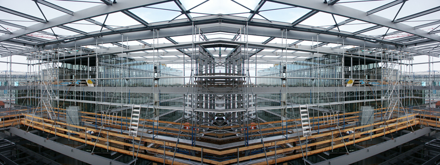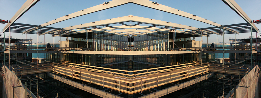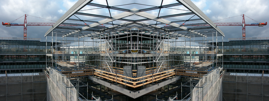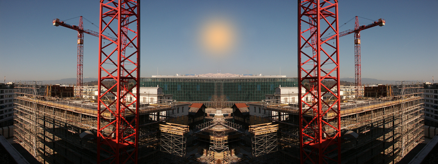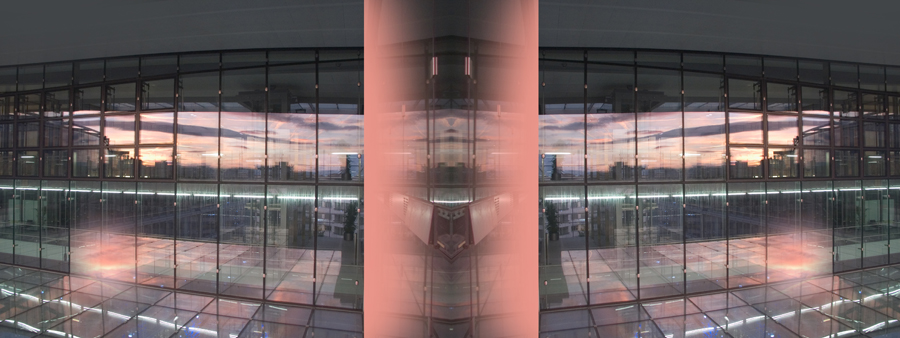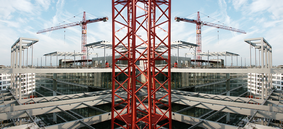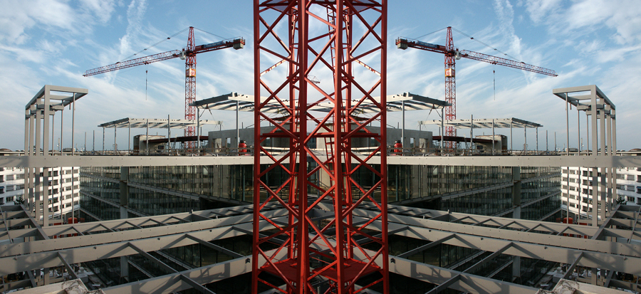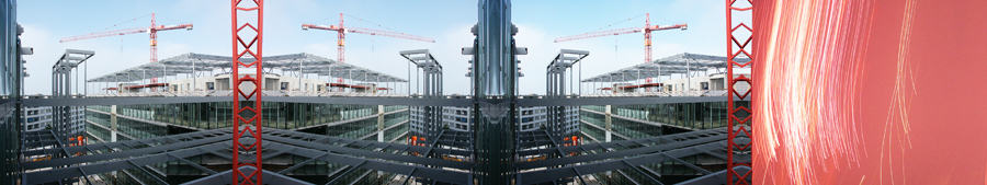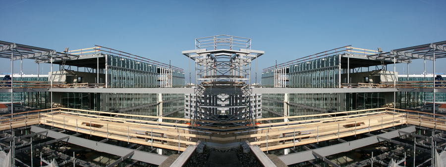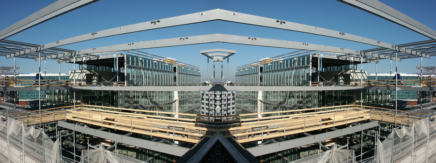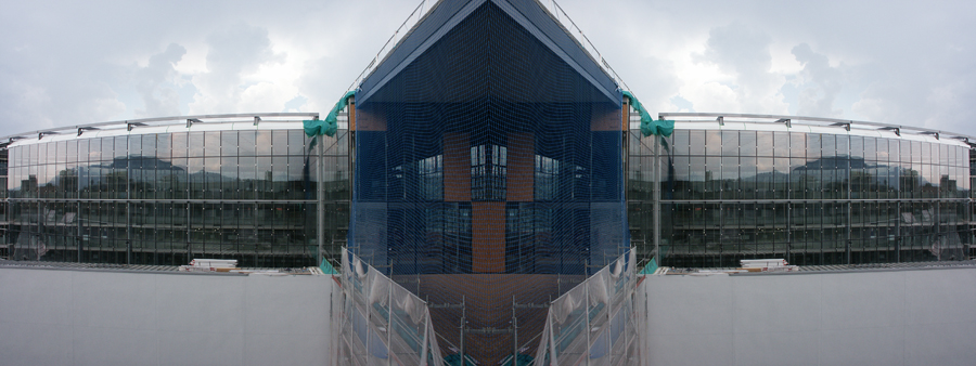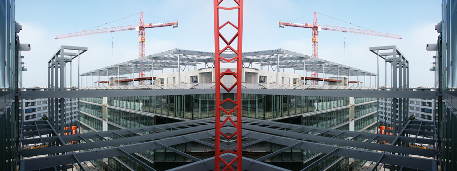 La série « Segments d’architecture en miroir » souligne l’élégance formelle du complexe achevé. Images d’architecture de notre temps, dédoublées en miroir, qui montrent une inclinaison vers des figures idéales de construction.