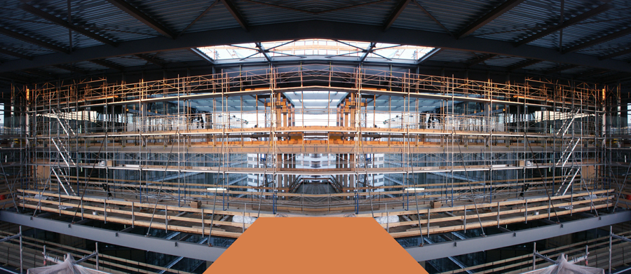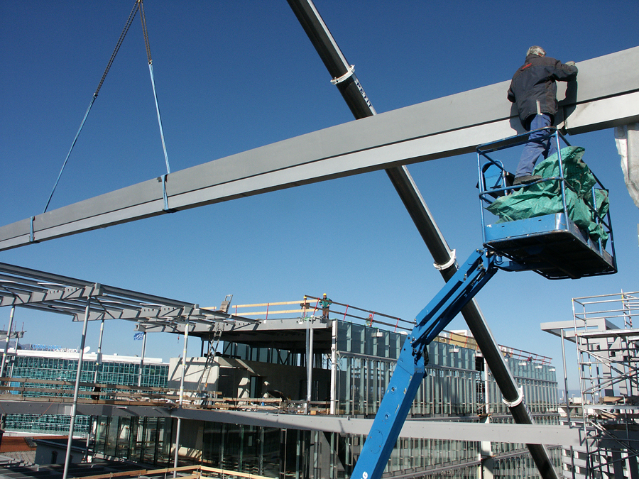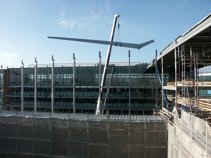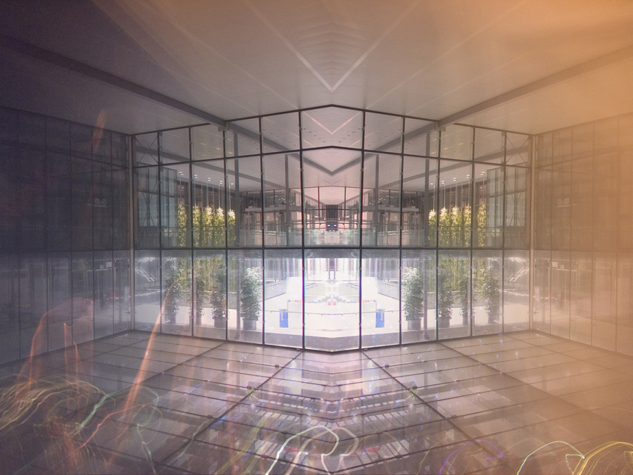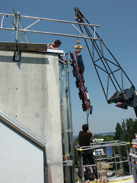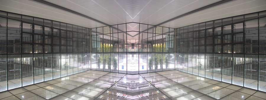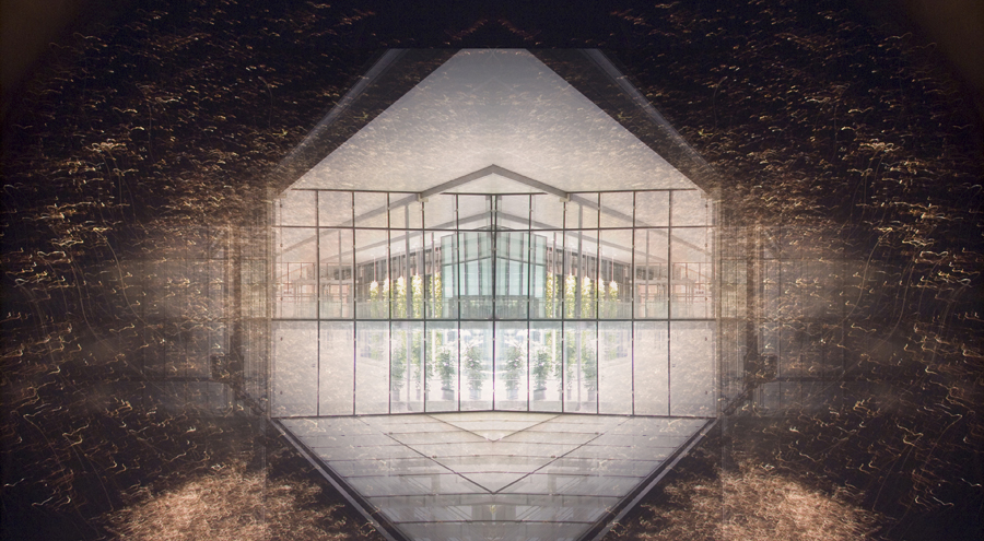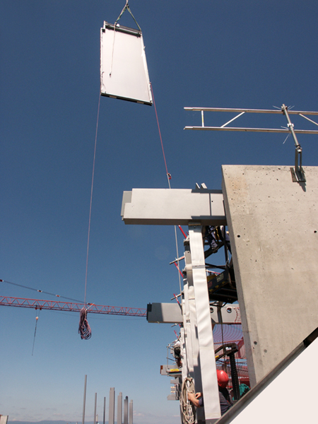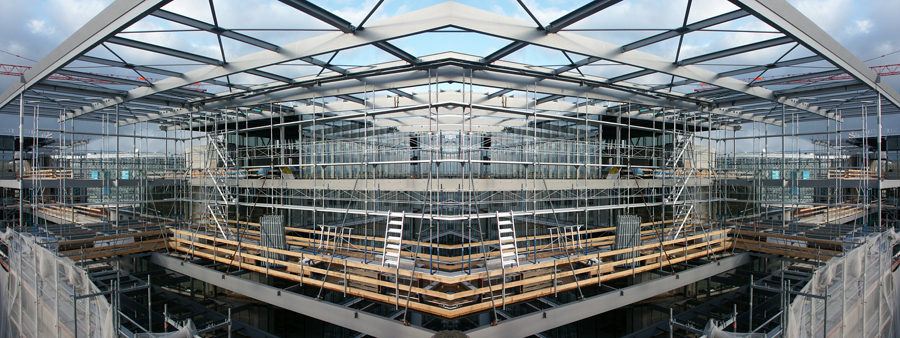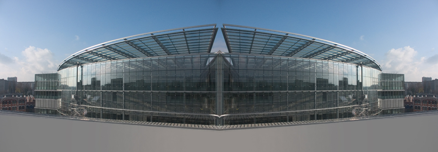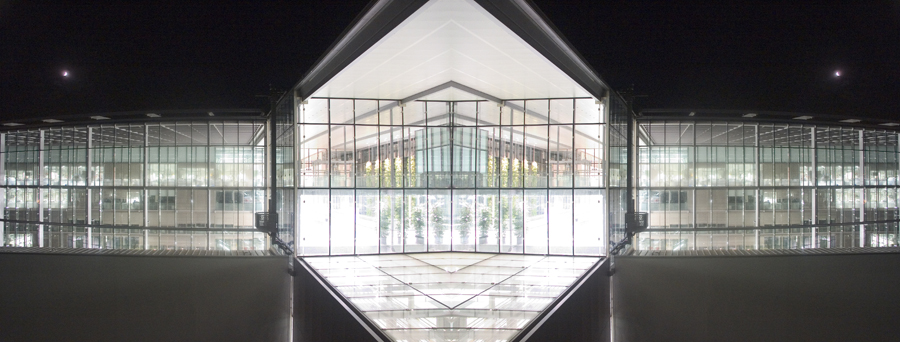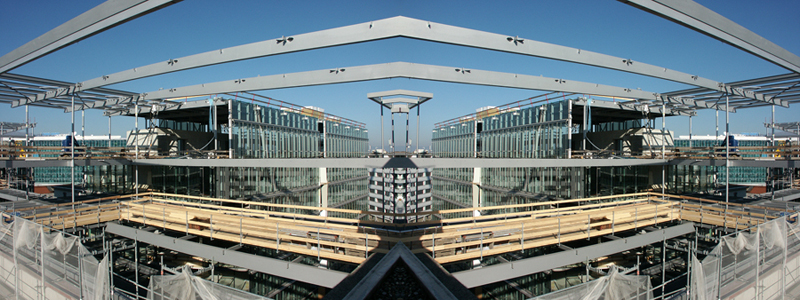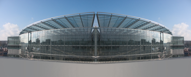 La série « Segments d’architecture en miroir » souligne l’élégance formelle du complexe achevé. Images d’architecture de notre temps, dédoublées en miroir, qui montrent une inclinaison vers des figures idéales de construction.