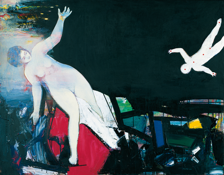 Peignant un monde déchiré et éclaté, celui de la Renaissance ou celui du vingtième siècle, estompant le passé par la nouveauté de sa forme, Jean- Claude Prêtre a le courage de chercher un sens à travers la maîtrise de la matérialité de la peinture. Appuyée sur les grands mythes de l’antiquité qui réveillent de profonds échos cachés au fond de notre inconscient, sa peinture est riche de signification. Mais l’étude des maîtres du passé, qui ont dépeint ces mythes, lui a aussi rappelé que la peinture est avant tout un espace rempli de couleurs qui lui donnent son individualité. La citation ne mène donc pas à l’autoréflexion où bute une grande partie de l’art contemporain. Il ne refuse cependant pas la modernité ni les dédales que découvre la pensée en abyme – ses constantes références au procédé pictural en sont la preuve – mais il cherche ce qu’il y a de plus riche dans l’histoire de l’art. En fait, au lieu de vouloir définir l’art par neutralisations successives, il vise au contraire à la complexité la plus grande possible. La complexité et la croissance ne sont-ils pas les éléments qui caractérisent l’évolution? »