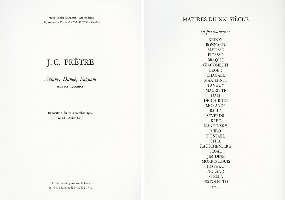 Catalogue J.C. Prêtre, Ariane, Danaé, Suzanne, Galerie Marie-Louise Jeanneret – Art moderne, Genève, 1984, pp. 7-9, extrait