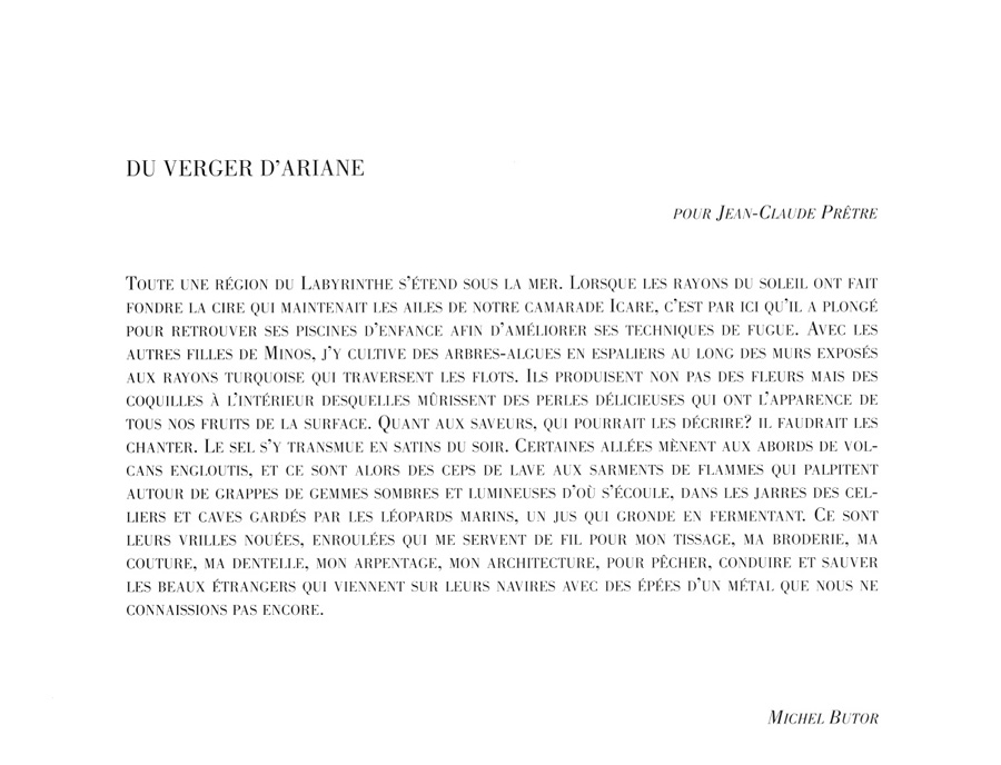 pour JEAN-CLAUDE PRÊTREToute une région du Labyrinthe s’étend sous la mer. Lorsque les rayons du soleil ont fait fondre la cire qui maintenait les ailes de notre camarade Icare, c’est par ici qu’il a plongé pour retrouver ses piscines d’enfance afin d’améliorer ses techniques de fugue. Avec les autres filles de Minos, j’y cultive des arbres-algues en espaliers au long des murs exposés aux rayons turquoise qui traversent les flots. Ils produisent non pas des fleurs mais des coquilles à l’intérieur desquelles mûrissent des perles délicieuses qui ont l’apparence de tous nos fruits de la surface. Quant aux saveurs, qui pourraient les décrire ? Il faudrait les chanter. Le sel s’y transmue en satins du soir. Certaines allées mènent aux abords de volcans engloutis, et ce sont alors des ceps de lave aux sarments de flammes qui palpitent autour de grappes de gemmes sombres et lumineuses d’où s’écoule, dans les jarres des celliers et caves gardés par les léopards marins, un jus qui gronde en fermentant. Ce sont leurs vrilles nouées, enroulées qui me servent de fil pour mon tissage, ma broderie, ma couture, ma dentelle, mon arpentage, mon architecture, pour pêcher, conduire et sauver les beaux étrangers qui viennent sur leurs navires avec des épées d’un métal que nous ne connaissions pas encore.