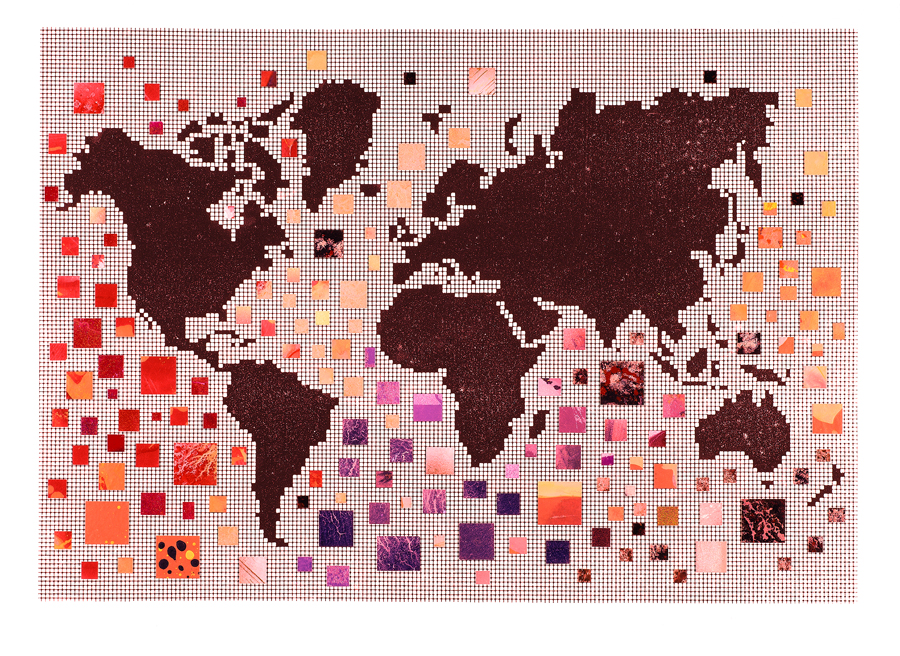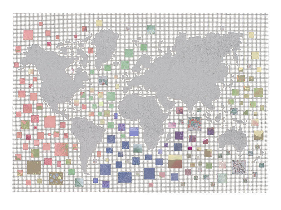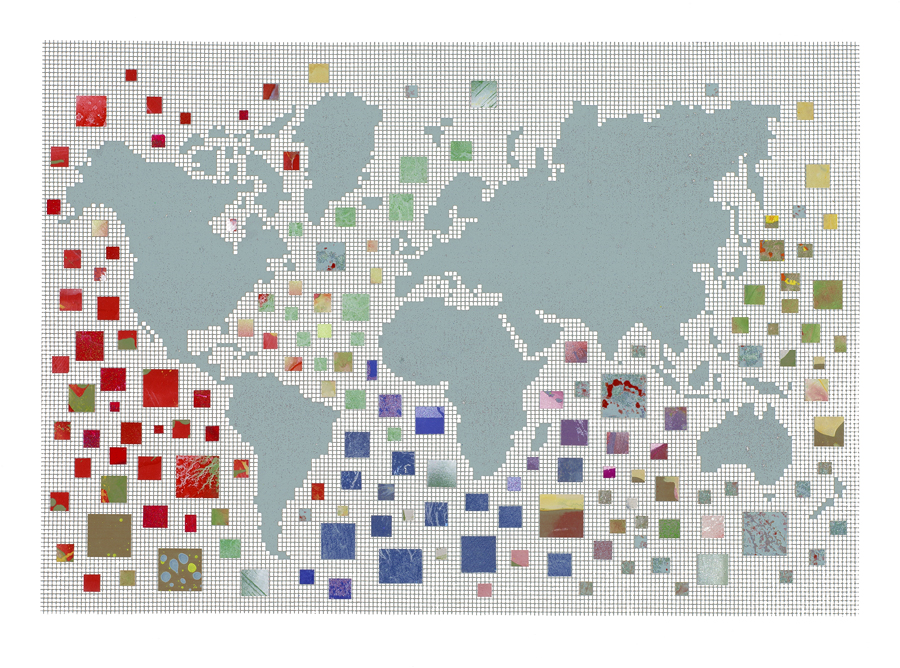 Dans les trois premières variations (A, B, C), les petits tableaux de différentes tailles occupent l’espace des mers et des océans. Dans la quatrième (D), la mosaïque polychrome envahit également l’intérieur des continents et renforce, dans un premier temps, l’impression d’enchevêtrement chaotique des formes.