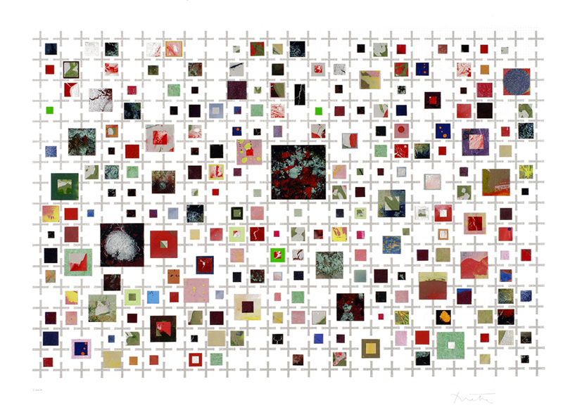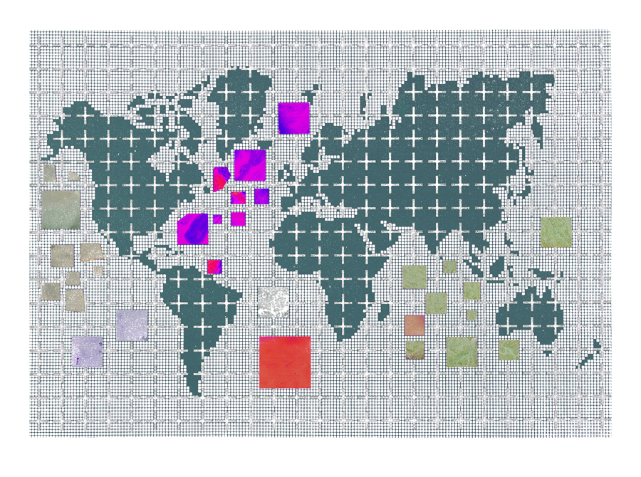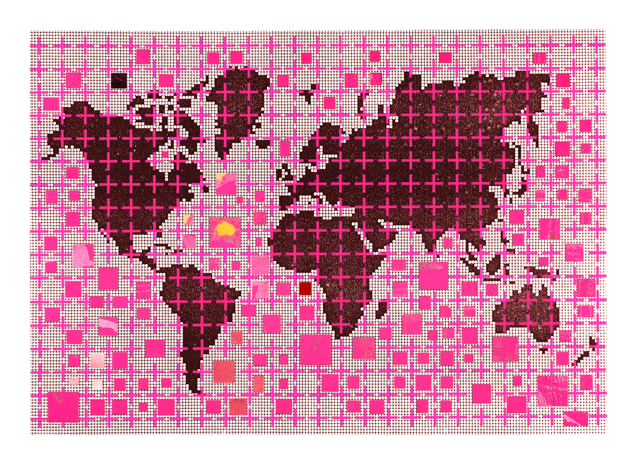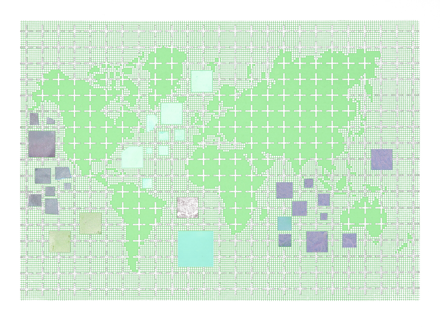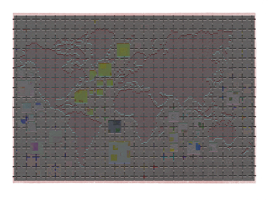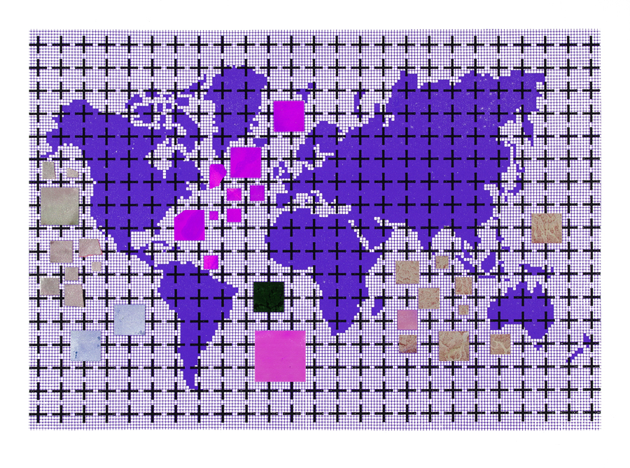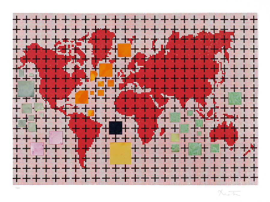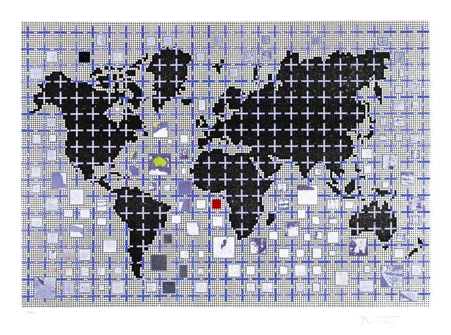 Tant il était clair que les attentats ne concernaient pas exclusivement New-York et l’Amérique mais bien le monde entier.De cette « image », je conçus quatre variations de base sur papier. La première, en noir et blanc, figure une grille qui recouvre entièrement la carte avec, en contrepoint, un assemblage de petits tableaux rectangulaires peints ; la deuxième, en rouge, et la troisième, en bleu, usent toutes deux, en plus, d’un dispositif de recouvrement de la carte par le signe de la croix mis en réseau ; la quatrième, polychrome, additionne grille, croix et riche combinaison de petites peintures juxtaposées.