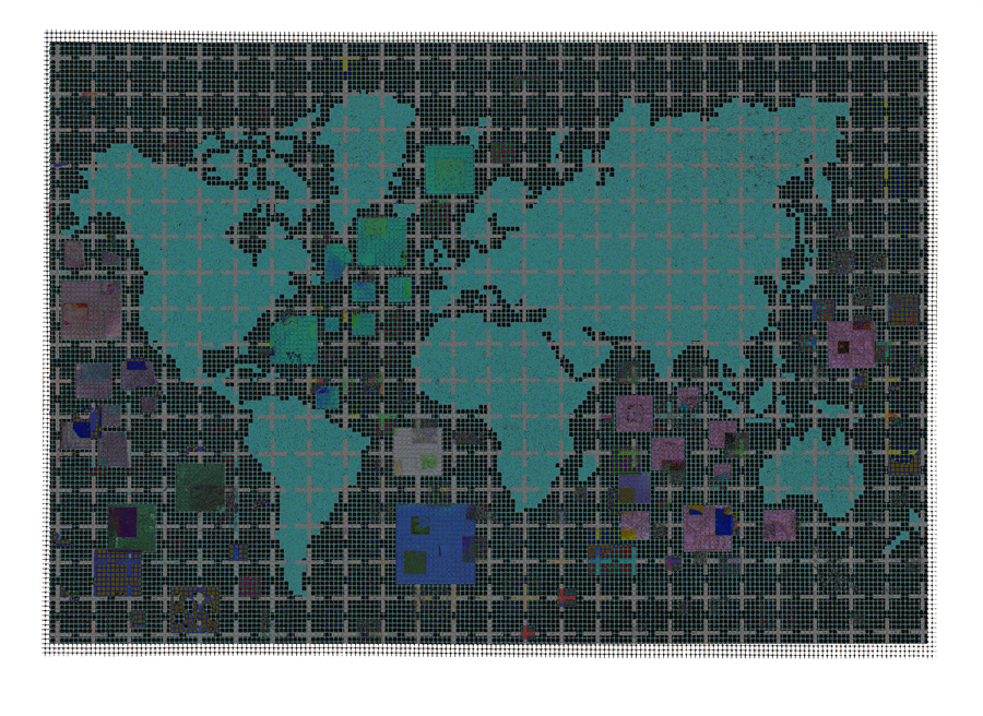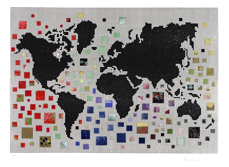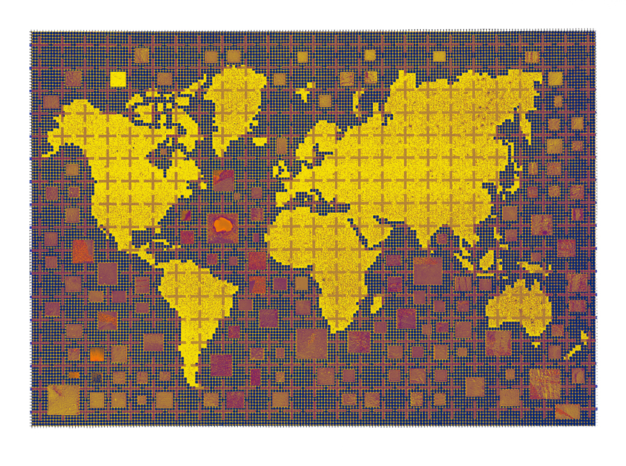 Superposée à l’espace clos et défiguré de Manhattan: l’ « image » de la terre – la carte de la terre la plus conventionnelle – mise sous grille avec les silhouettes des continents ciblés par un réseau de croix, et, en contrepoint, autour des figures continentales, une mosaïque de petites peintures de formats variés.