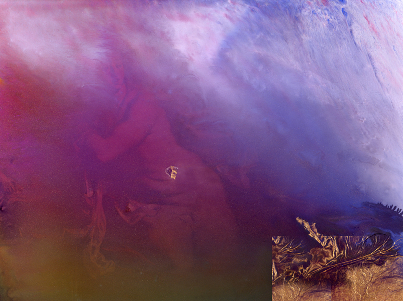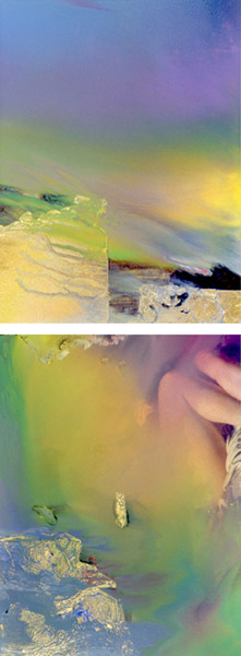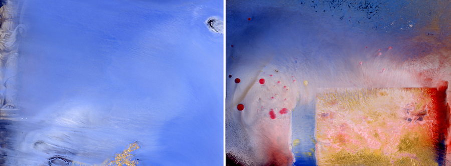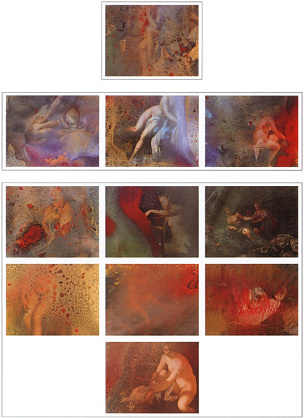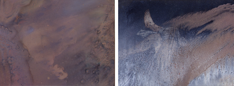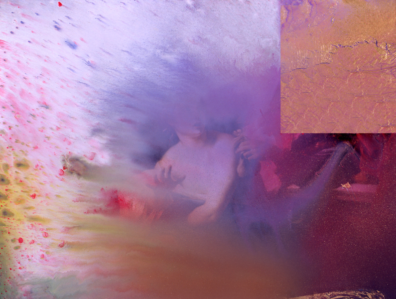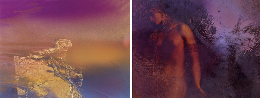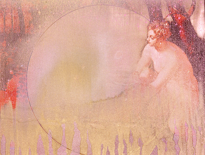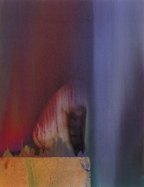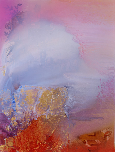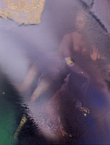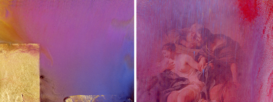 Au bout de dix ans de « concubinage » durant lequel il admet avoir malmené la dame, l’avoir dévoyée, morcelée et mise dans tous ses états, il en arrive à ce constat magnifique : on peut s’approcher du mystère du tableau, on ne l’épuise jamais. Impénétrable et transparente, telle lui apparaissait et lui apparaît encore la Suzanne de Tintoret « avec son aura de miel ». Tenter à travers elle de dire quelque chose de nouveau sans se couper du passé, tel fût le défi de l’aventure. Il l’a relevé avec une maestria éblouissante autant que « caméléonienne ». Où se cache l’artiste dans ce brillant jeu de rôles qui le montre rompu à toutes les manières et toutes les virtuosités ? Plus que dans les toiles et leur vaste fresque qui dresse un impressionnant morceau d’anthologie aux multiples facettes, c’est peut-être sa dernière suite, « D’après Suzanne, le procès du modèle 2 », qui est la plus personnelle. Travaillant sur des reproductions de ses multiples Suzanne historiques, il intervient avec des matières fluides et transparentes qui ne laissent que partiellement affleurer l’image, tandis que leurs coulures nacrées et leurs irisations, leurs flous lumineux et leurs paillettes dorées simulent les somptueuses patines du temps : moisissures, craquelures ou lichens aux dessins raffinés qui rappellent les préciosités et les mélancolies infinies d’un Gustave Moreau. L’image de Suzanne s’y estompe de plus en plus, s’y défait et finit par se fondre tout à fait dans des chatoiements d’émaux et des lambeaux de brumes mauves ou orangées.